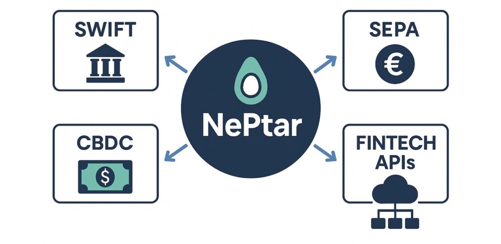 ✓ Purpose: Establish real-time compatibility between NePtar and external systems like SWIFT, SEPA, FedNow, and emerging CBDC networks. This enables structured financial data exchange, automated compliance, and rich metadata in every transaction.